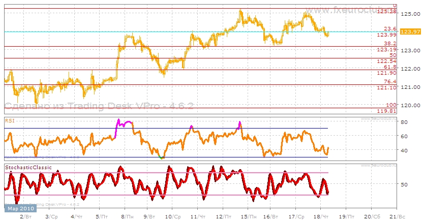 Пара евро-йена по-прежнему находится в боковом движении между двумя уровнями 0% или 125,28 и 38,2% или 123,19 по Фибоначчи. Скорее всего дальнейшее движение будет в том же канале. В альтернативном варианте торговли валюта пробьет уровень в 38,2% по Фибоначчи и отправится в сторону 50% и ниже. Классические индикаторы указывают нам на сигнал к продаже. Stohastic пересекается скользящими средними сверху вниз, но при этом находится почти возле зоны перепроданности, что указывает на слабый сигнал, а RSI после нескольких зигзаговых движений разворачивается возле зоны перепроданности.
