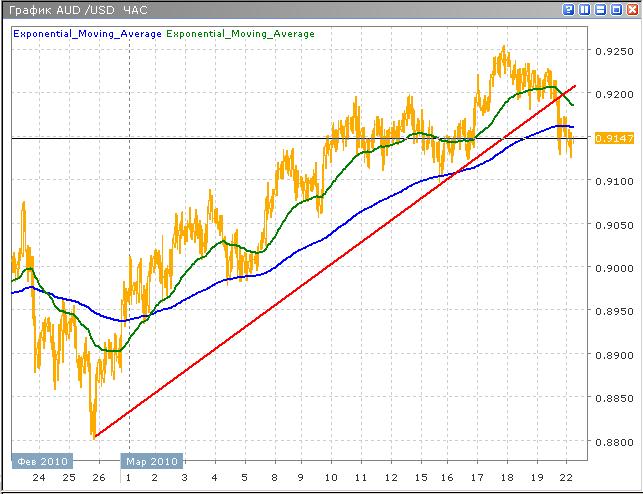 Валютная пара aud/usd находится в состоянии широкого волатильного бокового тренда. Торговый диапазон в течении зимы и начала весны находится в пределах 0.86-0.93. Сейчас котировки находятся в верхней части указанного диапазона. За время роста на графиках образовался повышательный канал с двумя точка соприкосновения. Но цены не смогли в ней удержаться, и 19 марта растущий тренд был сломан. Сейчас котировки находятся на уровне 0.915, что соответствует уровню недельной давности. Вблизи находится сильный уровень поддержки в районе 0.9100. Можно предположить, что сходу такой уровень пройти не удастся. Поэтому котировки могут находиться в пределах текущих значений длительное время. Снижение возобновится когда комбинация скользящих средних с периодами 55 и 200 пересечется. Целью понижения в таком случае можно будет считать достижения годового минимума в районе 0.8600.