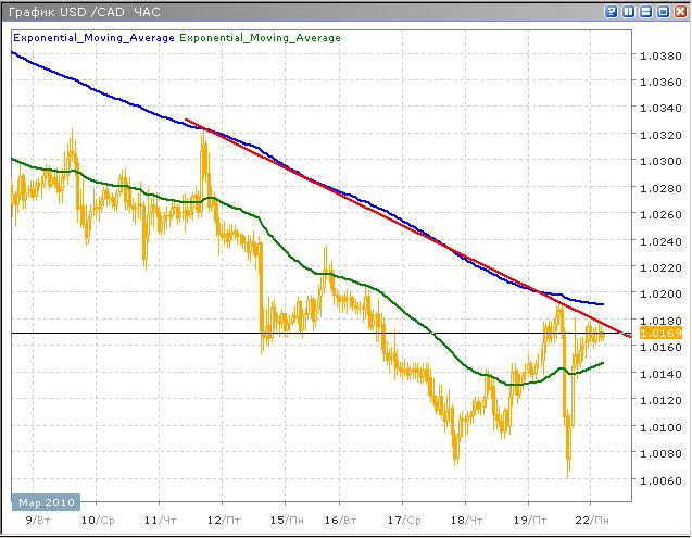 Валютная пара usd/cad в начале марта показала снижение, во время которого был обновлен годовой минимум на уровне 1.0250. Затем состоялось снижение в район 1.005. Далее цены понизиться не смогли, вернувшись назад к уровню пробитого минимума, превратившегося из поддержки в сопротивление. За время падения на часовых графиках образовался четкий понижательный наклонный канал. Верхняя граница этого канала совпадает со скользящей средней с периодом 200. Поэтому цены не смогут легко преодолеть эту линию вверх. Следовательно, более вероятным может стать сценарий продолжения падения после отскока от уровня 1.020. Целью понижения в таком случае может стать достижение прошлогодних минимумов на уровне 0.9700.