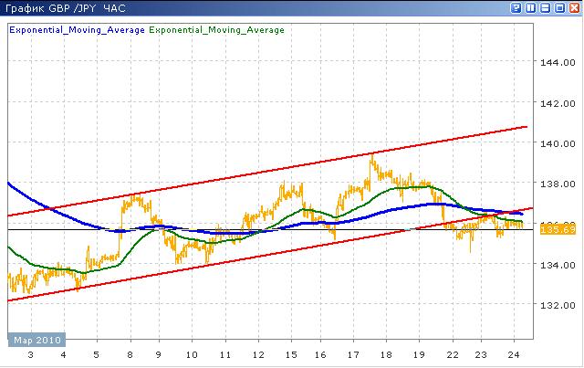 Валютная пара gbp/jpy находится в состоянии понижательного тренда, но в марте на ее графиках образовалась повышательная коррекция. Во время этой коррекции сформировался наклонный растущий канал. Котировкам удалось отскочить от локальных минимумов в районе 132.00 к локальным максимумам в районе 139.40. Нижняя линия этого канала тестировалась сверху пять раз, но все попытки были безуспешны. Наконец в конце 19 марта эту линию удалось пробить и цены снова устремились вниз. После пробоя линии тренда цены попытались вновь подняться выше ее, но эта попытка не удалась. Этот факт свидетельствует в пользу сценария продолжения падения в ближайшее время. К тому же, быстрая скользящая средняя с периодом 55 пересекла сверху медленную скользящую среднюю с периодом 200. Целью движения вниз может стать уровень равный ширине наклонного, отложенной вниз из точки пробития. Таким целевым уровнем в данном случае является район 130.00.