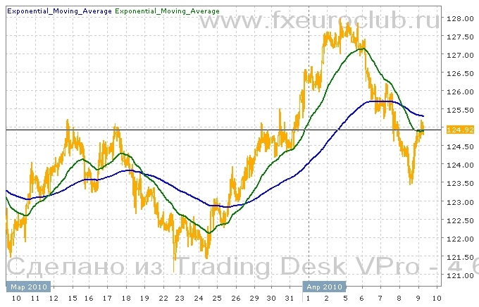 Комбинация скользящих средних с периодами 55 и 200 сейчас находится в положении падающего тренда, поскольку быстрая линия находится под медленной. В данных условиях рост котировок валютной пары eur/jpy вряд может быть подолжен.