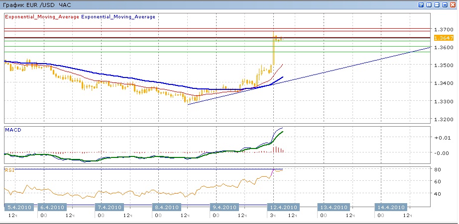 Решение стран Евросоюза об оказании помощи Греции оказало существенную поддержку евро, которое сегодня с начала торгов выросло до уровней середины марта, торгуясь сейчас в районе сопротивления на 1.3650. Средние скользящие ЕМА21 и ЕМА55, индикаторы MACD и RSI, отражая этот резкий рост пары, также резко ушли вверх. Последние три часа пара кнсолидируется в диапазоне 1.3630-1.3650, имея в качестве следующей цели вверх уровень 1.3700. нисходящее движение будет направлено на преодоление поддержки 1.3630 и последующе тестирование 1.3600, после которого следует ожидать движения к 1.3570