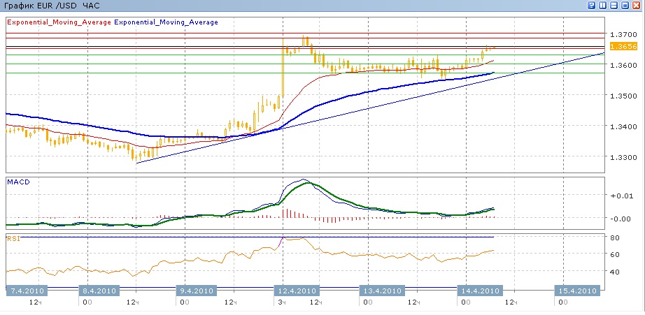 Открытие в понедельник с гэпом вверх придало импульс паре, которая не добралась до уровня 1.3700 несколько пунктов, после чего начался откат. Всю вторую половину понедельника и весь вторник пара торговавалсь, получая уверенную поддерку на уровне 1.3570, который выдержал попытки продавцов снизить пару, и вообще, вчерашний день прошел под знаком консолидации в пределах 1.3570-1.3630. с начала сегодняшних торгов пара находится в руках быков, которые преодолели уровнеь 1.3600 и настроены проверить на прочность сопротивление на 1.3650. Средние скользящие ЕМА21 и ЕМА55 направлены вверх, индикаторы MACD и RSI после снижения понедельника-вторника начала расти. Целью вверх на сегодня является преодоление сопротивления на 1.3650 с последующей попыткй обновления макисмумов понедельника 1.3694 и тестированием уровня 1.3700. Цель вниз — поддержка на 1.3630, затем уровень 1.3600 (с поддеркой паре от ЕМА21) и уровень 1.3570 (с поддеркой от ЕМА55).