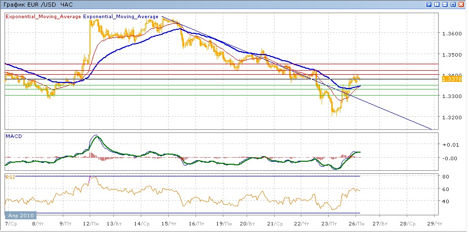 С 14 апреля пара продолжает снижаться. Движение середины недели вдоль нисходящей линии в конце четверга-первой половине пятницы усилилось, в результате чего продавцы опустили пару до уровней практически годовой давности — на уровне 1.3200 пара была в самом начале мая прошлого года. Последовавшие затем столь же активные покупки подтолкнули пару на 200 пунктов к отметке 1.3400, чуть ниже которой она сейчас торгуется в ходе сегодняшней сессии. Средние скользящие ЕМА21 и ЕМА55 готовятся к пересечению вверх, индикаторы MACD и RSI находятся выше своих центральных линий и замедляются. Цель вверх — уровень 1.3400, далее 1.3420 и 1.3450. цель вниз — отметка 1.3350 с поддержкой от ЕМА21 и ЕМА55, далее 1.3300.