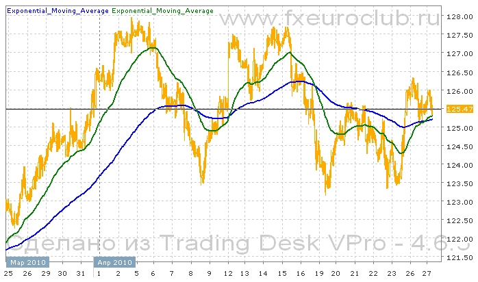 Валютная пара eur/jpy в последнее время находится в широком боковом коридоре в диапазоне 123.00-127.80. Первое время котировки повышались к локальным максимумам, но с начала апреля они активно снижались. За время падения котировки опустились с уровня 127.80 до уровня 123.40, отыграв половину предыдущего роста. В данный момент котировки находятся практически в середине указанного коридора. Поэтому дальнейшее движение определить практически невозможно. Наиболее вероятным видится сценарий ускорения падения после пробития вниз уровня 123,00. Хотя, комбинация скользящих средних с периодами 55 и 200 сейчас находится в положении растущего тренда, поскольку быстрая линия пересекла снизу вверхз медленную. И обе сейчас имеют наклон вверх. В данных условиях поведение котировок валютной пары eur/jpy может остаться хаотическим в границах указанного канала.