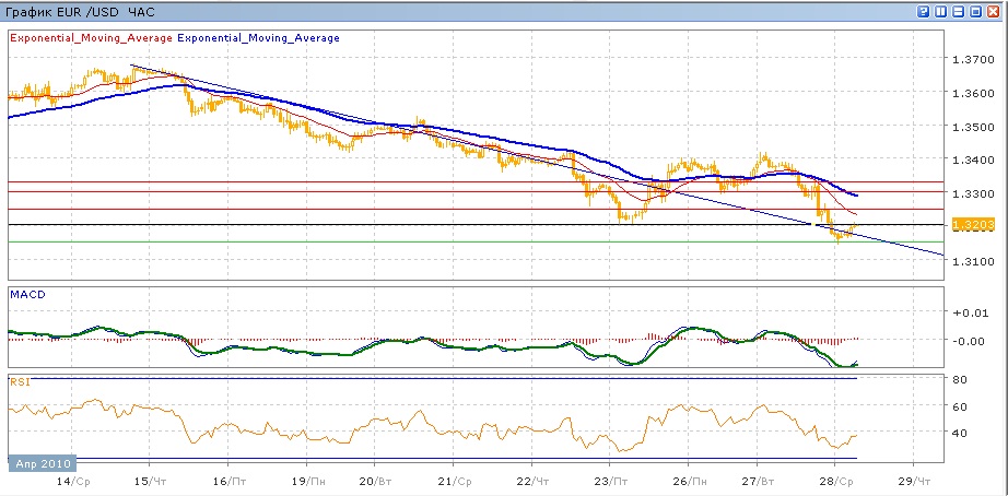 Два дня роста в пятницу и понедельник завершились на уровне 1.3400, который был дважды тетсирован, но безрезультатно. Вчера на новостях по Греции и Португалии наблюдалось усиление американского доллара, в результате чего пара за одинь день ушла вниз на более чем 200 пунктов, показав годовой минимум. На сегодняшних торгах пара пока растет, частично отыгрывая всерашнее падение, и пытается преодолеть уровень 1.3200. Средние скользящие ЕМА21 и ЕМА55 снова направлены вниз, индикаторы MACD и RSI находятся под своими центральными линиями и показывают некоторый рост. Цель вверх на сегодня — преодоление 1.3200, далее 1.3250 (с споротивлением от ЕАМ21) и затем тестирование 1.3300 (с сопротивлением от ЕМА55). Цель вниз — уход и закрепеление под 1.3200, затем движение к 1.3150.