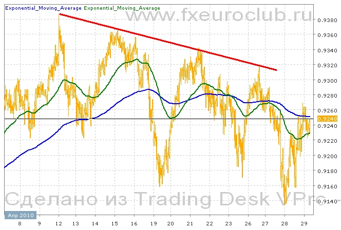 Валютная пара aud/usd находится в состоянии широкого волатильного бокового тренда. Но с конца марта на часовых графиках установился боковой горизонтальный канал. За это время котировки смогли подняться с уровня 0.900 до 0.9380. Сейчас на графиках формируется фигура продолжения тренда "флаг". После пробоя вверх уровня 0.9350 рост может ускориться. Но поведение скользящих средних сейчас говорит не в пользу роста котировок. В настоящее время быстрая скользящая средняя находится под медленной, но обе движутся практически горизонтально. Поэтому скорее всего продолжится боковой канал без определенного направления движения. В данных условиях повышение котировок валютной пары aud/usd вряд ли может быть продолжено. Хотя целью роста продолжает оставаться уровень 0.9500