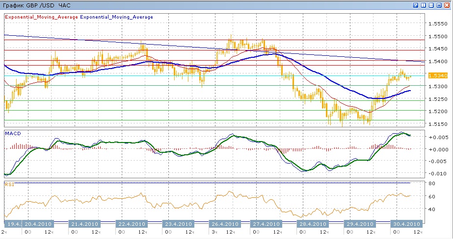 Торги в среду и первую половину четверга прошли на уровнях 6-8 апреля (1.5160), до которых пара снизилась в ходе снижения с 27 апреля. Вторая половина торгов четверга прошла под руководством покупателей, которые смогли поднять пару выше уровня 1.5300 и закрепиться на оотметке 1.5340. В самом начала торгов сегодня пара предприняла попытку дальнейшего роста, но это не удалось и сечас пара торгуется на уровне открытия под уровнем 1.5340. Средние скользящие ЕМА21 и ЕМА55 пересеклись вверх, индикаторы MACD и RSI находятся выше своих центральных линий и немного снижаются. Продолжение движения вверх сегодня имеет основной целью уровень 1.5400 ( с споротивлением на 1.5380 и от нисходящего сопротивления), далее 1.5440. Целью вниз является уровень 1.5300 (с поддержкой от проходящих под ним ЕМА21 и ЕМА55), далее 1.5240 и 1.5200.
