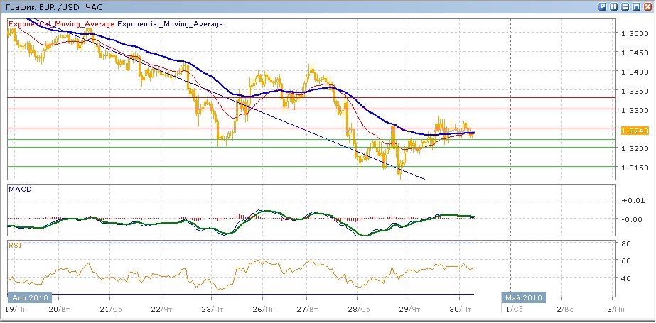 Попытка продолжить в среду начатое 27 апреля снижение не удалась, пару поддержали уровень 1.3150 и нисходящая поддержка. В четверг пара сумела преодолеть и закрепитсья выше отметки 1.3200, добравшись до сопротивления на 1.3250, вокруг которого она и торгуется в ходе сегодняшних торгов. Средние скользящие ЕМА21 и ЕМА55 готовы к пересечению вверх, индикаторы MACD и RSI находятся над своии центральными линиями и пока снижаются. Попытка роста упрется сначала в сопротивление на 1.3250, далее отметки 1.3300 и 1.3330. Целью вниз станет 1.3200 (с преодолением поддержки на 1.3220), далее 1.3150 с возможным повтореением миниумв среды на 1.3114.