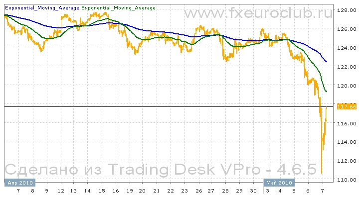 Валютная пара eur/jpy во время последнего падения показала ошеломительную скорость падения, преодолев за короткий промежуток времени почти десять фигур. Такое поведение валютного рынка является экстремальным и нетипичным для большей части торгового времени, поэтому анализировать подобную ситуацию необходимо с учетом экстраординарности падения. Явления такие происхоят нечасто, волатильность огромная, следовательно наилучшей тактикой поведения в данном случае будет закрытие всех открытых позиций. Определить дальнейшее направление движение в сложившихся условиях не представляется возможным, поскольку все трендовые индикаторы сейчас указывают на сильнейший падающий тренд, а шипообразный разворот величиной в 7 фигурсейчас говорит об обратном. Единственое что еще можно сделать в такой ситуации, это использовать тактику отскоков от уровней коррекции Фибоначчи 38,2%, 50% и 61,8% от величины последнего падения. Это уровни соответствено 117,11, 119,10 и 121,08. От этих уровней может состояться повторное падение.