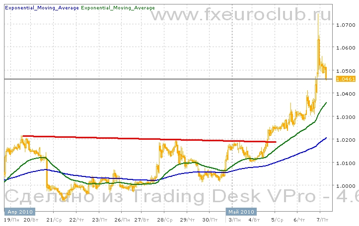 Валютная пара usd/cad во время вчерашний беспрецедентных событий на валютной рынке показала потрясающий рост, подпрыгнув с уровня 1,0300 до 1,0730. Этот экстраординарный вылет произошел по случайному поводу и с огромнейшей волатильностью. В это время сорвало множество стопов, а целая череда разных уровней сопротивления была пробита молниеносно. В таких условиях действовать привычными методами технического анализа невозможно, потому что многие индикаторы технического анализа отстали от рынка колоссально, и уже не могут адекватно помогать исследованию положения вещей. Например, скользящие средние с периодом 55 или 200 сейчас находятся на расстоянии в несколько фигур от текущих котировок. Поэтому наилучшим способом прогнозирования дальнейшего поведения цен станет ожидание коррекции после роста до уровней Фибоначчи 61,8% или 50% или 38,2%. Это соответственно 1,0420 или 1,0330 или 1,0200. После достижения этих уровней рост может продолжиться.