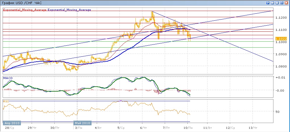Сопротивление на 1.1250 дважды сдержало пару 6 мая, не позволив ей показать новые максимумы. После этого началось снижение пары, в результате которого она сейчас торгуется на уровне 1.1020, пытаясь пробить эту поддержку, непреодоленную 6 мая. Средниескользящие ЕМА21 и ЕМА55 пересеклись вниз, индикаторы MACD и RSI глубоко ушли вниз под свои центрлаьные линии и продолжают снижаться. Цели вниз на сегодня — преодоление поддержки на 1.1020 и тестирование уровня 1.1000, с дальнейшим продвижением к 1.0950. Цель вверх — 1.1050, далее 1.1080 и тестирование 1.1100.