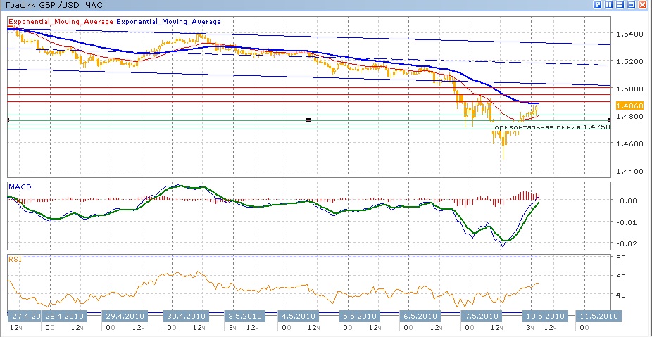 После неоднократного тестирования нижней границы нисходящего канала 6 мая пара вышла вниз из него, выход сопровождался уверенным движением на 200 пунктов. Пятница пршла под знаком борьбы продавцов и покупателей, которые опустили пару до более чем годовых минимумов (до уровня 1.4500) и затем подняли до 1.4800. С начала сегодняшних торгов покупатели пока снова контролируют торговлю, пара достаточно уверенно растет, оторвавшись от отметки 1.4800 и пытаясь преодолеть сопротивление в виде средней ЕМА55. Индикаторы MACD и RSI после минимумов пятницы растут и готовы к пересечению вверх своих центральных линий, средние скользящие ЕМА21 и ЕМА55 начинают разворачиваться вверх. На сегодня целями продлжающегося движения вверх станут 1.4900 (для чего потребуется преодолеть ЕМА55), далее 1.4950 и 1.5000. Цели вниз — 1.4800 (с поддержкой от ЕМА21), затем 1.4760 и 1.4730