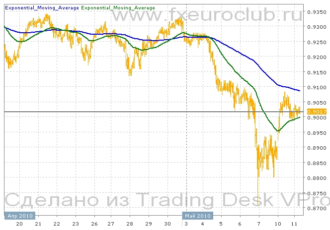 Валютная пара aud/usd к настоящему моменту отыграла практически все падение прошлой недели, когда бюджетные проблемы Европы привели к укреплению доллара против всех основных мировых валют. На прошлой неделе падение состоялось во время выхода котировок вниз из диапазона 0,0900-0,09120. Сейчас они вернулись в этот диапазон. При этом минимум падения был зафиксирован на уровне 0,8700. А максимум апреля находится на уровне 0,9380. Таким образом сейчас котировки находятся ровно посредине между локальными максимумом и минимумом. Дальнейшее движение должно будет происходить в сторону повышения, поскольку недавно цены преодолели вверх уровень быстрой скользящей средней с периодом 55. Затем эта скользящая средняя дважды становилась уровнем поддержки для котировок. Когда быстрая скользящая пересечет снизу вверх медленную с периодом 200, то повышение котировок ускорится.