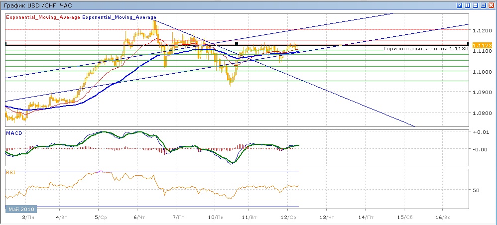 10 мая оказалось достаточно активным для пары — она смогла уйти ниже уровня 1.1000, но не сумела прорвать поддржку на 1.0950 , от которой пошла в рост, преодолела нисходящее сопротивление и добралась до отметки 1.1100. Вчера днень оказался по спокойней, пара двигалась большую часть торгов в узком диапазоне и эта сдержанная торговля продолжается и в ходе сегодняшних торгов. Пара тестирует сопротивление на 1.1130, средние скользящие ЕМА21 и ЕМА55 двигаются слабо вверх, индикаторы MACD и RSIнаходястя над своими центарльными линиямии несколько замедляются. Основная цель вверх сегодня — это достижеие уровня 1.1200 через преодоление сопротивлений на 1.1130 и 1.1150. Цель вниз — уровень 1.1100, далее 1.1080 (с поддержкой от ЕМА55), далее 1.1050.