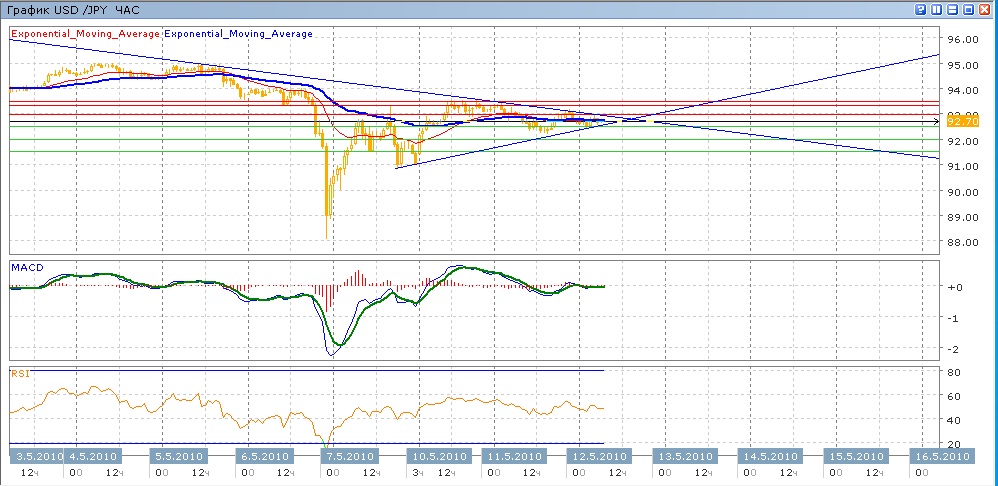 Понедельник и вторник прошлои для пра спокойно — большую част ьторгов понедельника пара тестировала сопровтивление на 93.35-93.50, после чего вовторник медленно снижалась. Сегодняшние торги идут вяло, пара торгуется в коридоре 92.50-93.00. Можно говорить о формировании на графике сходящеося треугольника. Средниескользящие ЕМА21 и ЕМА55 идут ровно, не указывая явно на како-либо движение. Индикаторы MACD и RSIбалансир