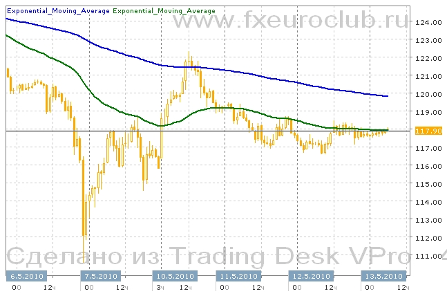 Валютная пара eur/jpy на прошлой неделе упала с уровня 125,5 до уровня 110,75. Падение было вызвано паникой вокруг бюджетной задолженности в Европе. Затем на выходных днях Евросоюз совместно МВФ принял решение по поддержке проблемных стран, что снизило риски в финансовой системе и рынки снова принялись расти. Во время первого всплеска котировок валютная пара eur/jpy достигла уровня 50% коррекции от предыдущего падения и снова пошла вниз. В этот раз минимум был зафиксирован на уровне 114,50. Затем снова состоялся рост. На этот раз был достигнут уровень 61% коррекции от прошлого падения. Сейчас котировки понемногу снижаются, закрепившись под линией быстрой скользящей средней с периодом 55, которая движется горизонтально и параллельно линии медленной скользящей средней с периодом 200. А так как быстрая средняя сейчас находится под медленной, то формально присутствует понижательный тренд. Который может продолжиться до повторения минимума в районе 110,50.