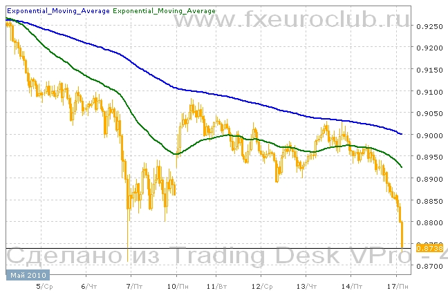 Валютная пара aud/usd в данный момент находится в состоянии сильного снижения после завершения коррекции на прошлой неделе. Ранее на графиках был образован отскок от минимальных уровней в районе 0,8700. Последующее затем повышение привело котировки в район 200-часовой скользящей средней, проходившей на уровне 0,9000. Во время двух неудачных попыток котировки так и не смогли преодолеть это уровень. Поэтому падение продолжилось. К тому же поведение скользящих средних сейчас говорит не в пользу роста котировок. В настоящее время быстрая скользящая средняя находится под медленной, и обе движутся вниз. Поэтому скорее всего продолжится ускорение снижения котировок. Возможной целью понижения является уровень 0,8500, после достижения которого вероятно произойдет коррекция вверх.