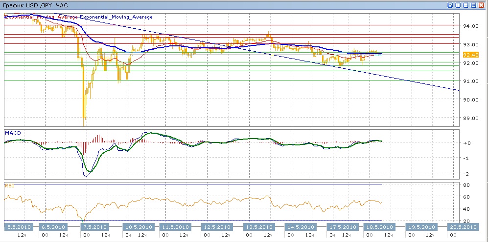 Наметившееся с середины 13 мая небольшое снижение пары ближе к концу пятницы застопорилось на уровне 92.00. Вчера этот уровень также оказывал поддержку паре, при этом пара торговалась в достаточно узкм диапазоне 91.80-92.50. Сегодня в ходе торгов пара торгуется вяло, двигаясь вдоль уровня 92.50. Средние скользящие ЕМА21 и ЕМА55 замедлились, индикаторы MACD и RSI сечас находятся практически на своих центральных линиях, показывая слабый рост. Движение вверх на сегодня нацелится на преодоление уровня 93.00 (для чего придется преодолеть сопротивление ЕМА55), далее отмекта 93.35- 93.50. Цель вниз — 92.00 (с поддержкой от ЕМА21), далее 91.80 и 91.50.