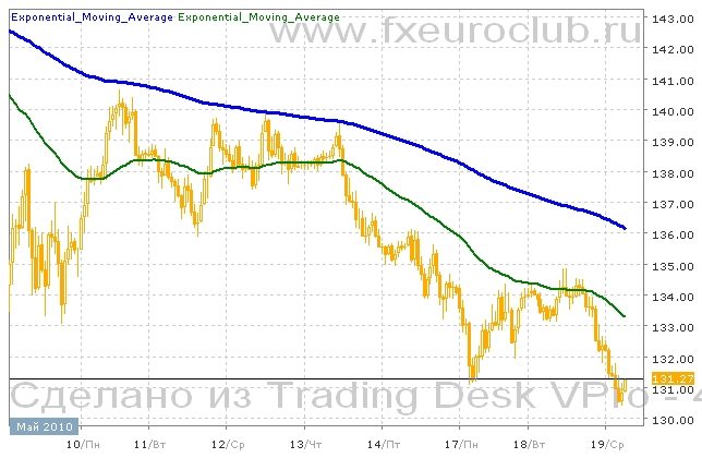 Валютная пара gbp/jpy продолжает снижаться и уже достигла уровня, который был достигнут во время предыдущего сильного падения 6 мая. Сейчас она находится в районе 130,00, который является сильной поддержкой. Дальнейшее движение скорее всего будет представлять собой отскок вверх от минимальных уровней. Но станет ли это движение коррекцией к падающему тренду или превратится в начало нового растущего тренда пока не ясно. Технические индикаторы пока говорят о возможном продолжении снижения. Комбинация сользящих средних, в которой быстрая с периодом 55 находится под медленной с периодом 200, и обе при этом понижаются, говорит о силе падающего тренда. Целью понижения в таком случае может стать район 120,00