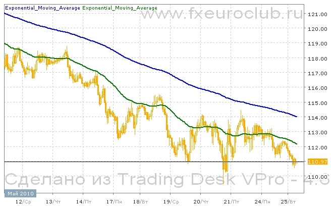 Валютная пара eur/jpy находится в состоянии устойчивого падающего тренда . Падение было вызвано паникой вокруг бюджетной задолженности в Европе. Во время всего движения вниз котировки находились под линией скользящей средней с периодом 55 и несколько раз совершали попытки выхода вверх за эту линию, но всякий раз возвращались вниз и падение продолжалось. Вот и сейчас котировки понемногу снижаются, закрепившись под линией быстрой скользящей средней с периодом 55, которая снижается и движется параллельно линии медленной скользящей средней с периодом 200. А так как быстрая средняя сейчас находится под медленной, то формально присутствует понижательный тренд. Если уровень поддержки в районе 110,50 не устоит, то следующей целью снижения может стать район 100,00.