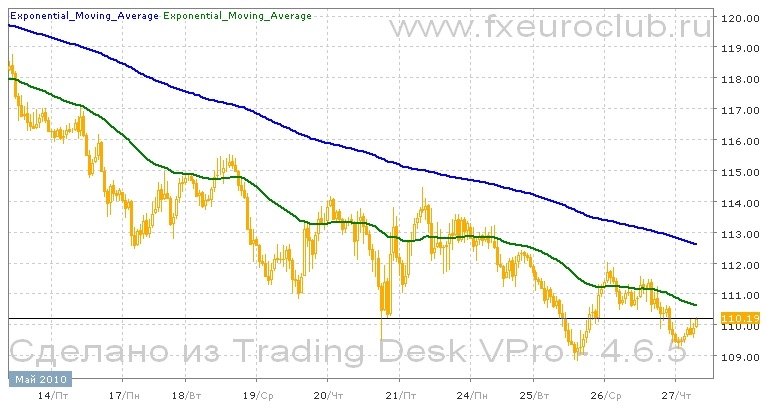 Валютная пара eur/jpy продолжает свое снижение в рамках долгосрочного понижательного тренда. Но минимальный уровень предыдущего падения 6 мая в районе 110,50 не устоял и котировки уже опустились ниже этого уровня. В данный момент сила падающего тренда на исходе, поскольку все движения вниз происходят с затухающей амплитудой, Поэтому не исключено некоторое повышение котировок в рамках коррекции к падающему тренду. Хотя технические индикаторы, такие как комбинация скользящих средних с периодами 55 и 200 долгое время находится в положении падающего тренда, поскольку быстрая линия пересекла снизу вверх медленную. И обе сейчас активно понижаются. В данных условиях поведение котировок валютной пары eur/jpy может перерасти в ускорение падения после преодоления уровня 108,00. Целью понижения в таком случае является уровень 103,00.