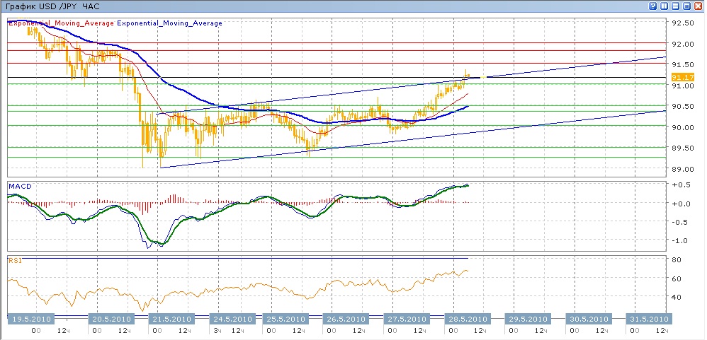 В среду пара активно торговалась около уровня 90.50, который и был ею преодолен во второй половине вчерашнего торгового дня. Импульс роста оказался достаточно хорош для того, чтобы добраться до отметки 91.00. Сегодня пара после слабого снижения в начале торговли показывает небольшой рост, торгуясь выше 91.00. Средние скользящие ЕМА21 и ЕМА55 пересеклись вверх и растут, индикаторы MACD и RSI также растут над своими центральными линиями. Продолжение роста направлено на отметку 91.50 с последующим движением к 92.00. Цель вниз на сегодня — 91.00 (с поддержкой от верхней границы восходящего канала), далее 90.50 (с поддержкой от восходящих ЕМА21 и ЕМА55), затем 91.00.