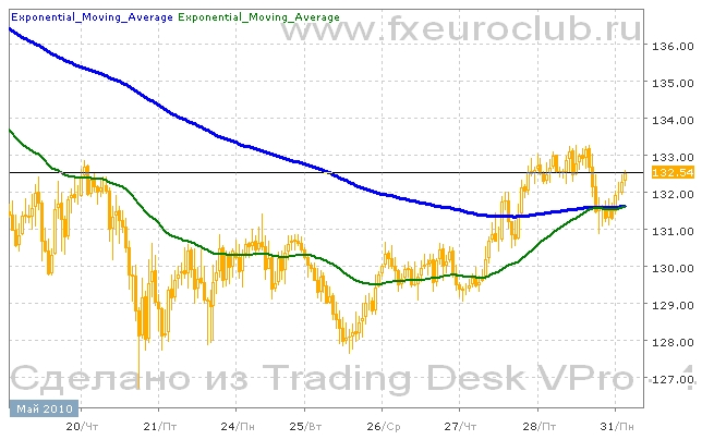 Валютная пара gbp/jpy закончила свое снижение в рамках локального падающего канала и приступает к повышению. После отскока от уровня 126,50 на прошлой неделе на графиках сформировалась разворотная фигура "двойное дно". После пробоя вверх уровня 131,30 следующей целью повышения является уровень 136,30. Но станет ли это движение вверх коррекцией к падающему тренду или превратится в начало нового растущего тренда пока не ясно. Технические индикаторы пока говорят о возможном продолжении начале повышения. Комбинация скользящих средних, в которой быстрая с периодом 55 находится пересекает снизу вверх медленную с периодом 200, говорит начале нового восходящего тренда. Максимальной целью повышения в таком случае может стать район 140,00