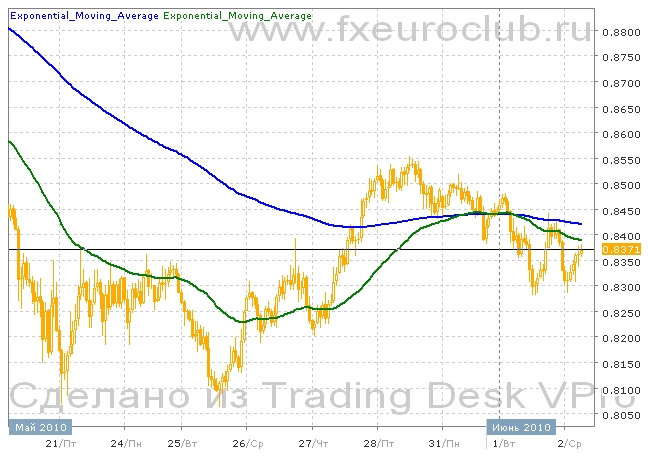 Валютная пара aud/usd некоторое время назад находилась в состоянии падающего тренда. Но движение вниз приостановилось на уровне 0,8050 Сейчас на графиках стал формироваться горизонтальный канал с границами 0,8050 и 0,8550. Этот канал может стать как разворотной фигурой "двойное дно", так и фигурой продолжения падения "флаг". Но скорее всего продолжится снижение. К тому же поведение скользящих средних сейчас говорит не в пользу роста котировок. В настоящее время быстрая скользящая средняя находится под медленной, и обе движутся вниз. Поэтому скорее всего продолжится ускорение снижения котировок. Возможной целью понижения является уровень 0,8000, после достижения которого вероятно произойдет коррекция вверх.