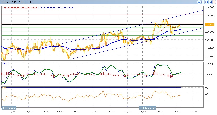 Пара продолжает двигатся в восходящем канале, начатом 25 мая. Во вторник, после попытки выйти из канала вниз и закрепиться ниже 1.4460, пара резко взлетела вверх к его верхней границе, преодеолеть которую не удалось. Первую половину торгов вчера пара продолжала проверять на прочность верхнюю границу, а затем также стремительно упала к нижней границе. С начала сегодняшних торгов пара растет, нацелившись на преодоление отметки 1.4700. Средние скользящие по-прежнему направлены вверх, индикаторы MACD и RSI снова начала расти и находятся выше своих центральных линий. Цель вверх на сегодня — 1.4700, далее 1.4750 и затем 1.4800 (с спопротивлением от верхней границы). Цель вниз — 1.4650 (с поддержкой от ЕМА21), затем 1.4600(с поддержкой от ЕМА55), и далее — 1.4550.