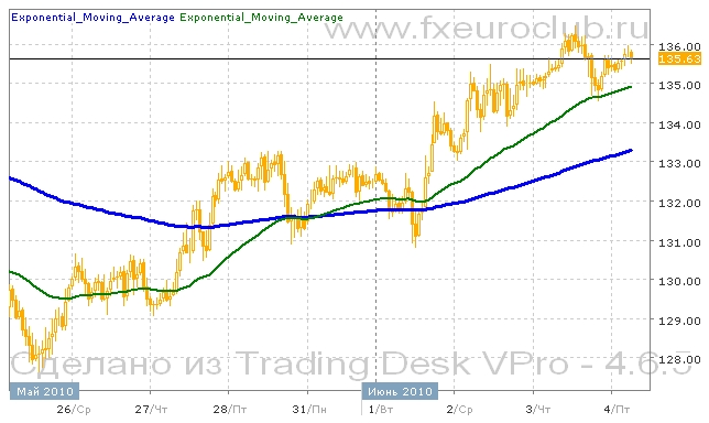 Валютная пара gbp/jpy закончила свое снижение в рамках локального падающего канала и в данный момент повышается. После отскока от уровня 126,50 на прошлой неделе на графиках сформировалась разворотная фигура "двойное дно". После пробоя вверх уровня 131,30 следующей целью повышения стал уровень 136,30. Сейчас эта цель выполнена и после небольшой коррекции или консолидации на достигнутых уровнях станет ясно, превратится ли это движение в начало нового растущего тренда. Технические индикаторы пока говорят о возможном продолжении повышения. Комбинация скользящих средних, в которой быстрая с периодом 55 находится выше медленной средней с периодом 200, говорит о силе восходящего тренда. Ближайшей целью повышения в таком случае может стать район 140,00