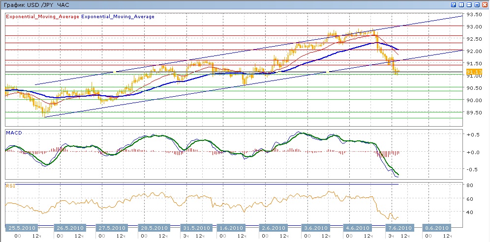 Четверг и первая половина пятницы прошли под знаком продолжения восходящего тренда пары — она двигалась в верхней части канала, постоянно тестируя его верхнюю границу. Но во второй половине активизировались продавцы, в результате чего пара пошла вниз и закрылась практически на нижней границе восходящего канала. Сегодяншние торги также идут с понижением пары, она сейчас получает поддержку от уровня 91.00. Средние скользящие ЕМА21 и ЕМА55 пересеклись вниз, индикаторы MACD и RSI ушли глубоко вниз под свои центральные линии. Цели продолжения движения вниз на сегодня — 91.00, далее 90.50 и 90.00. Цели вверх — 91.40, 91.60 и 92.00 (с споротивлением от направленных вниз ЕМА21 и ЕМА55).