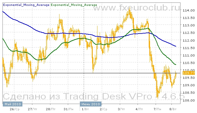 Валютная пара eur/jpy продолжает свое снижение в рамках долгосрочного понижательного тренда. Но понижение в последнее время значительно замедлилось. Последние несколько дней котировка не удается опуститься ниже уровня 108,00. Но любая попытка роста тут же пресекается. Поэтому можно считать, что на графиках образовалось боковое движение без выраженного тренда. Хотя технические индикаторы, такие как комбинация скользящих средних с периодами 55 и 200 долгое время находятся в положении падающего тренда, поскольку быстрая линия пересекла снизу вверх медленную. И обе сейчас движутся параллельно. В данных условиях поведение котировок валютной пары eur/jpy может перерасти в ускорение падения после преодоления уровня 108,00. Целью понижения в таком случае является уровень 103,00.
