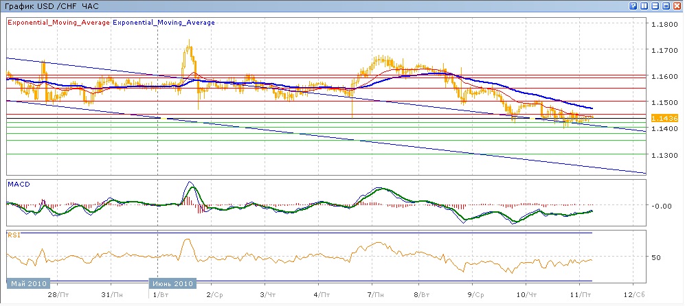 9 и 10 июня пара продолжала снижение, начатое ею 7 июня. В среду пара преодолела нижнюю границу бокового канала 1.1500, а в четверг, после попытки роста и тестирования вверх этого уровня, пара продолжила снижение в ходе торгов достигнув уровня 1.1400. с начал асегодняшних торгов пара немного растет, пытаясь преодолеть сопротивление нисходящей средне скользящей ЕМА21. Несколько выше этйо средней снижается также уверенно и ЕМА55. Индикаторы MACD и RSI находятся под своими центральными линиями и постепенно растут. Цель вверх на сегодня — 1.1450 (с сопротивлением от ЕМА21), далее 1.1500 (с сопротивлением от ЕМА55), далее 1.1550. Цели вниз — 1.1420, далее 1.1400, 1.1380 и 1.1350.