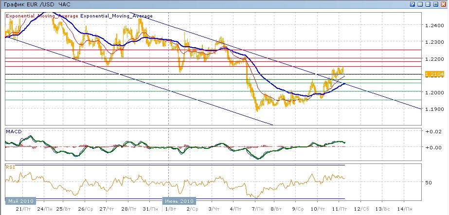 Двухдневное движение в пределах 1.1900-1.2000 завершилось. Во второй половине среды пара сделала попытку выбраться ввех из канала, добравшись до отметки 1.2050, но закрылась пара все же внутри боковика. Вчера, на фоне позитиивных новостей мз Японии, Китая и Австралии, заставивших инвестров поверить в глобальное восставновление, пара пошла более уверенно в рост и закрылась выше уровня 1.2100, сумев выйти из нисходящего канала. В ходе сегодяншних торгов пара снижается и сейчас пытается преодолеть вниз уровень 1.2100. Между тем, средние скользящие ЕМА21 и ЕМА55 растут, а индикторы MACD и RSI, находясь над своими центральнымми линиями, начинают снижаться. Продолжение роста направлено сегодня на уровни 1.2150, 1.2180, 1.2200.Целями вниз станут уровень 1.2100, далее 1.2070, 1.2050 (попытка уйти ниже этого уровня будет осложнена поддержкой восходящей ЕМА55 и верхней границей нисходящего канала)