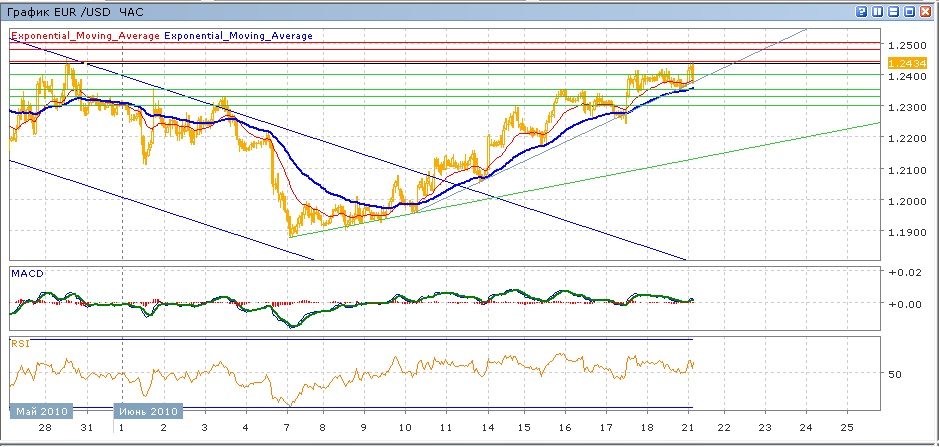 Начатое 7 июня восходящее движение продлжается, сила роста пары остается прежней с 10 июня. В четверг пара не могла продавить восходящую поддержку, от которой во второй половине дня она порядка 150 пунктов до уровня 1.2400. в пятницу была более спокойная торговля в диапазоне 1.2350-1.2400. Сегодняшние торги открылись гэпом вверх, последовавшее движение вниз не отыграло его (паре вновь помогла восходящая поддежка), так что пара торгуется на уровне открытия. Средние скользящие ЕМА21 и ЕМА55 продолжают рост, максимумы индикаторов MACD и RSI при этом с 15 июня снижаются, так что вариант закрепления пары выше 1.2450 пока что маловероятен. Цели вверх на сегодня — 1.2450 и 1.2500. Цели вниз — 1.2400, далее 1.2350 (помощь паре от восходящей поддержки, ЕМА21 и ЕМА55), 1.2330