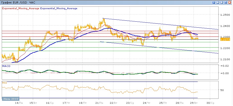 Пара с 21 июня постепенно снижается. В конце пятницы была попытка тестирования уровня 1.2400, которая в пондельник не была никак поддержана, в результате чего пара снизилась ниже отметки 1.2300. Сгеодняшние торги проходят без чьего-либо преимущества, пара торгуется на уровня х открытия, получая локульную поддержку на отмектке 1.2280. Средние скользящие ЕМА21и ЕМА55 пересеклись вниз, индикаторы MACD и RSI снова оказались по своимим центральными линиями, отражая динамику последних 5 дней. Цели вверх на сегодня — уровень 1.2300, дале 1.2330 (с сопротивлением от ЕМА21и ЕМА55), затем 1.2350. Цель вниз — 1.2250, затем преодоление минимума 23 июня и тестирвоание отметки 1.2200, далее 1.2170.