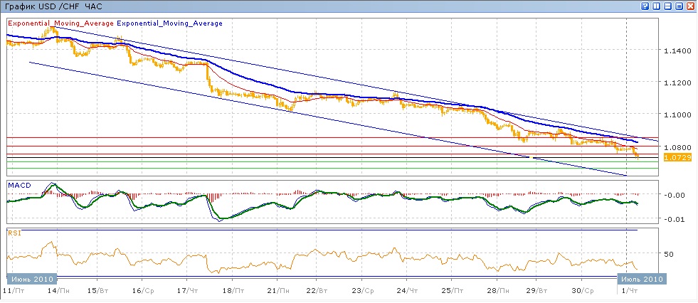 Пара продолжает снижение, начатое ею 7 июня. Вторник и среду пара снижалась, испытывая сопротвиление со стороны ЕМА21, выше которой ей удалось лишь кратковременно закрепиться вво второй половине вторника. Вчерашний день был завершен ниже уровня 1.0800, движение от котрого вниз продолжилось и сегодня — пара преодолела поддержку на 1.0750 и устремилась к 1.0700, добравшиьс до более чем двухмесячного минимума. Средние скользящие ЕМА21 и ЕМА55 все также направлены вниз, индикаторы MACD и RSI вот уже парктически как неделю находятся ниже своих центральных линий и снова начинают снижаться. Целью вниз на сегодня является тестирование и преодоление уровня 1.0700 с последующим движением к 1.0660. Цель вверх — 1.0750 и далее движение к 1.0800 (с сопротивлением от ЕМА21).