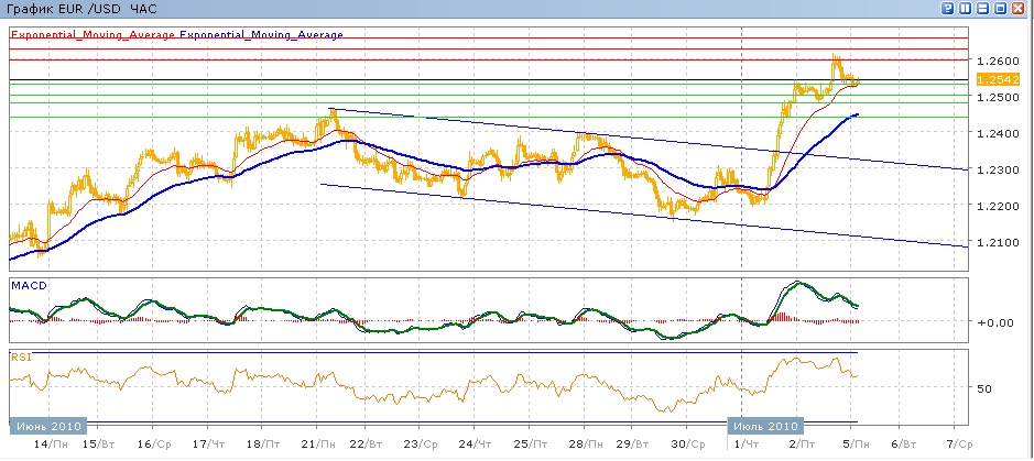 Снижение пары, шедшее с 21 июня, завершилось в четверг, когда евро (после естирования вниз отметки 1.2200) стремительно вырос на более чем 300 пунктов и преодолев уровень 1.2500. в пятницу покупатели снова продемонстрировали силу, подняв пару к 1.2600, после чего она начала снижаться к 1.2530. сегодня пара торгуется практически без измнений к цене открытия, индикаторы MACD и RSI снижаются к своим центральным линиям, средние скользящие ЕМА21и ЕМА55 показывают уверенный рост пары. На сегодня вверх имеем целью уровень 1.2600, затем 1.2630 и 1.2660. цель вниз — 1.2530 (с поддержкой от ЕМА21), далее 1.2500, 1.2480 и затем 1.2450 (с поддержкой от ЕМА55)