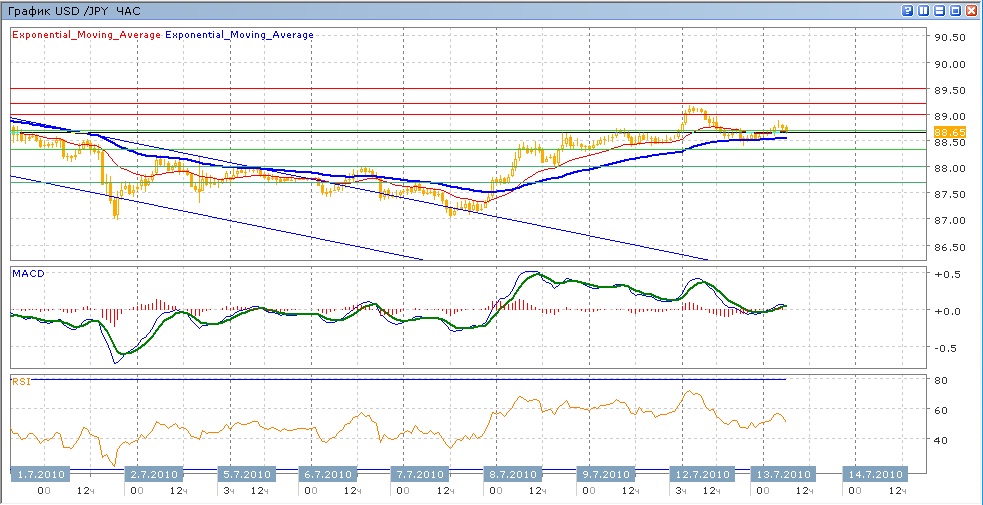 Торговля в пятницу в пределах 88.35-88.70 в понедельник продолжилась ростом пары, сумевшей временно преодолеть уровень 89.00 и затем снова закрывшейся в районе 88.70 благодаря поддержке восходящей средней ЕМА55. С начала сегодняшних торгов пара слабо растет, средниескользящие ЕМА21 и ЕМА55 растут, но начинают замедляться, индикаторы MACD и RSI с четверга снижаются и уже смогли кратковременно опуститься ниже своих центральных линий, вернувшись сейчас снова выше них. Продолжающийся рост пар сегодня будет направлен на тестирование и преодоление уровня 89.00, далее 89.20 и затем 89.50 (уровнеь 28-29 июня). Цели вниз на сегодня — 88.70, далее 88.35 ( на пути к которому пара может получить поддержку от ЕМА21 и ЕМА55), затем 88.00.