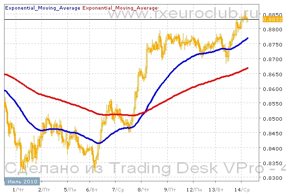 Валютная пара aud/usd к настоящему моменту находится недалеко от максимальных значений за последние недели. Серьезных коррекций к росту пока еще не было, но, скорее всего, этот рост будет продолжен. Недавно был подтвержден важный уровень поддержки в районе 0,8800. Цены попытались протестировать этот уровень с верхней стороны и он устоял. Поэтому сейчас дальнейшей целью движения может стать возврат в район 0,9000. Согласно расположению скользящих средних сейчас началась восходящая фаза движения котировок. Поскольку быстрая скользящая средняя с периодом 55 пересекла снизу вверх медленную скользящую среднюю с периодом 200. И обе средние сейчас начинают повышаться. Следовательно рост в этой ситуации более вероятен.
