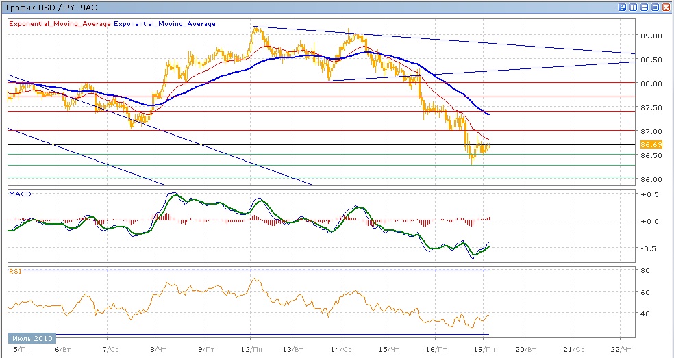 В четверг пара вышла вниз из формировавшегося сходящегося треугольника. Выход застопорился на поддержке 87.40, которая в ходе торгов в пятницу была все таки преодолена. Пара ушла вниз на более чем 100 пунктов, показав минимум на 86.26 — более чем 8-месячный минимум. Средние скользящие ЕМА21 и ЕМА55 после небольшого роста снова пересеклись вниз и снижаются, индикаторы MACD и RSI показывают некоторый рост, находясь глубоко под своими центральными линиями. На сегодня цели вниз — 86.50, далее преодоление минимума пятницы на 86.26 с последующим тестированием 86.00. Цели вверх — тестирование отметки 87.00 и затем движение к 87.40 (с сопротивлением от нисходящей ЕМА55).