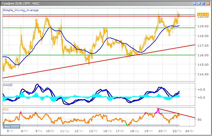 Тестируя значимый уровень сопротивления, пара в очередной раз его преодолела, однако, чтобы закрепиться выше этого уровня, быкам понадобится более значительные силы. В настоящий момент, на часовом графике мы наблюдаем формирование восходящего треугольника, при разрешении которого цена может устремиться по меньшей мере к отметке 123.00. Формирование треугольника еще не завершено, фигура достаточно надежная, ее завершение ожидается к концу этой недели. В краткосрочной перспективе, наиболее вероятен откат к линии тренда, после чего снова рост. В пользу этого предположения свидетельствуют как фундаментальные так и технические индикаторы. В течение этой недели ожидается укрепление японской валюты, при этом единая валюта будет находиться под давление продаж после резкого отвращения инвесторов от доллара США на прошлой неделе. Индикатор RSI демонстрирует медвежью дивергенцию, что можно видеть на часовом графике. В то время как гистограмма MACD формирует локальный максимум. Поскольку пара находится вблизи уровня сопротивления, а глобальный тренд является нисходящим, занятие коротких позиций — наиболее рациональное решение. Однако сигналам на вход в рынок стоит уделить максимум внимания, поскольку пара обратиться в боковой тренд на несколько дней.