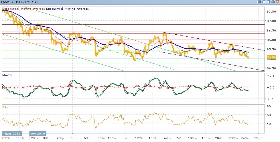 с 6 августа снижение пары приостановилось, пара пока не может уверенно преодолеть и закрепиться под уровнем 85.00. при этом с 16 авгутса наблюдается формирование нисходящего треугольника, упирающегося в 85.00.в ходе сегодняшних торгов пара снижается, нацелившись на преодоление этого уровня. Средние скользящие ЕМА21 и ЕМА55 медлено снижаются, индикаторы MACD и RSI после небольшого роста снова оказались ниже своих центральных линий. Основная цель на сегодня вниз — это тестирование 85.00, после чего возможно повторное продвижение к минимуму 11 августа на 84.70. Цели вверх — 85.40 (с сопротивлением от ЕМА21, ЕМА55), далее85.80 и тестирование 86.00