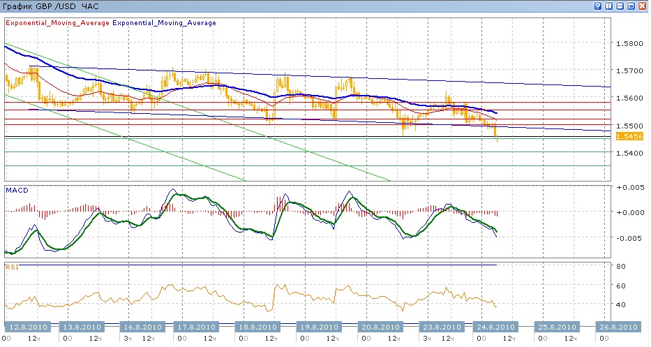 нисходящий тренд замедлился и с 18 августа пара медленно снижалась, нацеливишись на уровень 1.5500. пятница и понедельник прошли под знаком тестирования этой отметки, а входе сегодняшних торгов на данный момент паре удалось преодолеть его и нижнюю границу нисходящего канала.и добраться до 1.5460. Средние скользящие ЕМА55 и ЕМА21 немного усилились в своем снижении, индикаторы MACD и RSI находятся сейчас под своими центральными линиями и продолжают снижаться. Цели движения вниз на сегодня — преодоление 1.5450 с продолжением движения к 1.5400 и к 1.5350. Движение вверх направлено будет на тестирование уровня 1.5500 (с сопротивлением от нижней границы канал), далее 1.5550 и 1.5580.