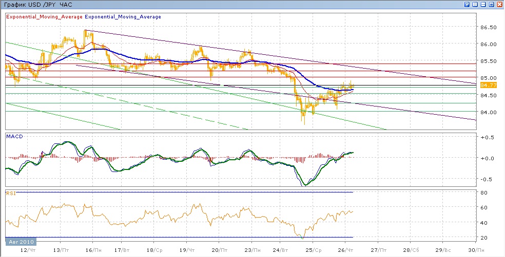 японская йена несмотря ни на что продолжает свое укрепление. Во вторник начавшееся снижение пары усилилось к полудню и пара ушла вниз обновив свой 15-летний минимум, показав отметку в 83.59. после этого она начала восстанавливаться и концу вчерашних торгов закрылась на уровне 84.80, снова войдя в нисходящий канал. Сегодняшние торги проходят пока с очень небольшим ростом пары. Средние скользящие ЕМА21 и ЕМА55 готовятся к пересечению вверх, индикаторы MACD и RSI после обвала во вторник росли и сейчас находятся выше своих центральных линий, замедлив при этом свой рост. Цели вверх на сегодня — это рост к отметке 85.00, далее 85.20 (с сопротивлением от верхней границы канала) и 85.40. Цели вниз — движение к 84.00 (с преодолением поддержки от ЕМА21 и ЕМА55, и 84.50, 84.25)