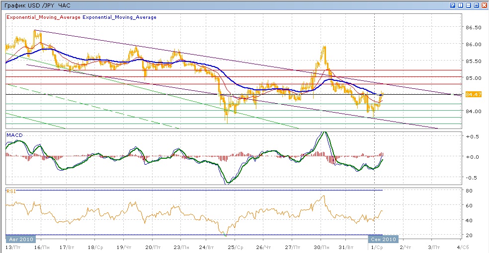 рост к отметке 86.00 оказался не достаточно сильным, чтобы добраться до нее, после этого пара ушла вниз на более чем 100 пунктов, закрепившись ниже 84.60. во вторник снижение продолжилось, пара проверяла на прочность уровень 84.00, но закрепиться ниже его ей не удалось и в итоге, в ходе сегодняшней торговли пара показывает уверенный рост. Средние скользящие ЕМА21 и ЕМА55 замедлили снижение и готовы к росту, индикаторы MACD и RSI сейчас находятся ниже своих центральных линий, показывая уверенный рост. Цели вверх на сегодня — это рост к отметке 84.80 (с сопротивлением от ЕМА55), далее 85.00 и 85.20 . Цели вниз — движение к 84.20, далее 84.00, затем повторение вчерашнего минимума на 83.79.