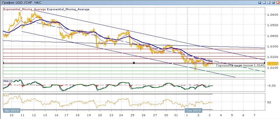 Снижение пары в пределах нисходящего канала продолжается. В среду была предпринята попытка преодолеть вниз уровень 1.0100 и закрепиться под ним, но она не удалась. Показав почти 10-месячный минимум, пара затем снова вышла над 1.0100, выше которого торговалась весь вчерашнйи день и торуется выше которого и сегодня. Средние скользящие ЕМА21 и ЕМА55 направлены вниз, индикаторы MACD и RSI находятся ниже своих центральных линий и с 31 августа растут. Вероятно, на сегодня целями вверх станут 1.0140, далее 1.0180 и 1.0200. Движение вниз направлено на тестирование 1.0030 с последующим движением к минимуму среды на 1.0064 и к 1.0035 далее.