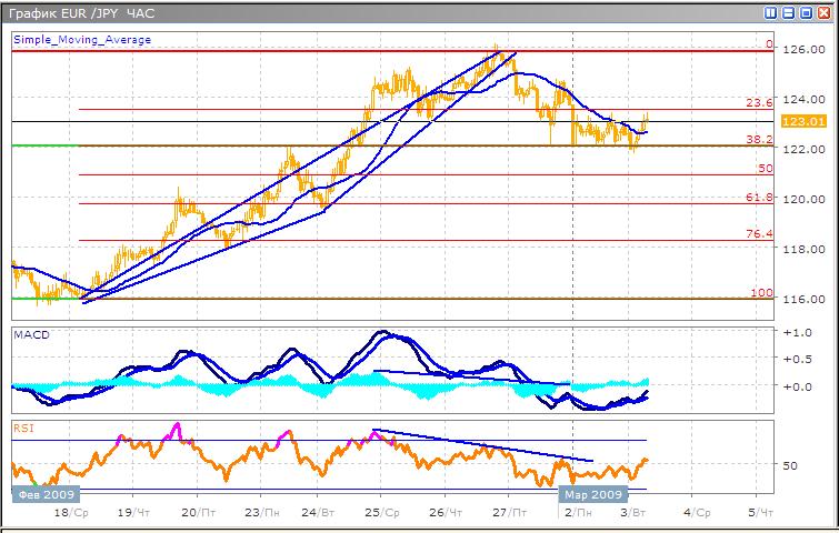 Единая валюта, аналогично британскому фунту, теряет позиции против японской йены, подтверждая ранее идентифицированные разворотные сигналы. Цена дважды протестировала при откате уровень фибоначчи 38.2, обозначив уровень поддержки. В настоящий момент цена растет, корректируя снижение. В среднесрочной перспективе ожидается продолжение нисходящего тренда, после умеренного роста, начало которого мы сейчас наблюдаем. Осциллятор MACD сигнализирует о продолжении роста, гистограмма уверенно растет в положительной области, в то время как ее скользящие также подают сигнал к покупке. График индикатора RSI также подает бычий сигнал, пересекая снизу вверх среднюю линию. Поскольку ожидается только умеренный рост, покупка на данном этапе будет сопряжена с чрезмерными рисками. В данной ситуации рекомендуем выждать завершения восходящей коррекции, путем анализа более мелких периодов, и занятие короткой позиции.