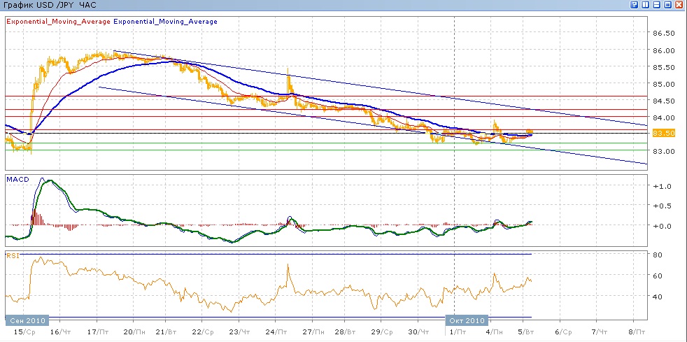 Пара продолжает двигаться в рамках нисходящего тренда. Последние три дня пара стабилизировалась и торгуется в достаточно узком диапазоне, получая поддержку на уровне 83.20.с начала сегодняшних торгов пара немного подросла, тестируя сопротивление на 83.60. Средине скользящие ЕМА21 и ЕМА55 практически пересеклись вверх, индикаторы MACD и RSI снова находятся над своими центральными линиями, показывая спрошлого четверга постепенный рост. Цели вверх на сегодня — преодоление отметки 83.60, далее 84.00 и 84.20. Цели вниз — 83.20 (с поддержкой от ЕМА55 и ЕМА21), далее 83.00